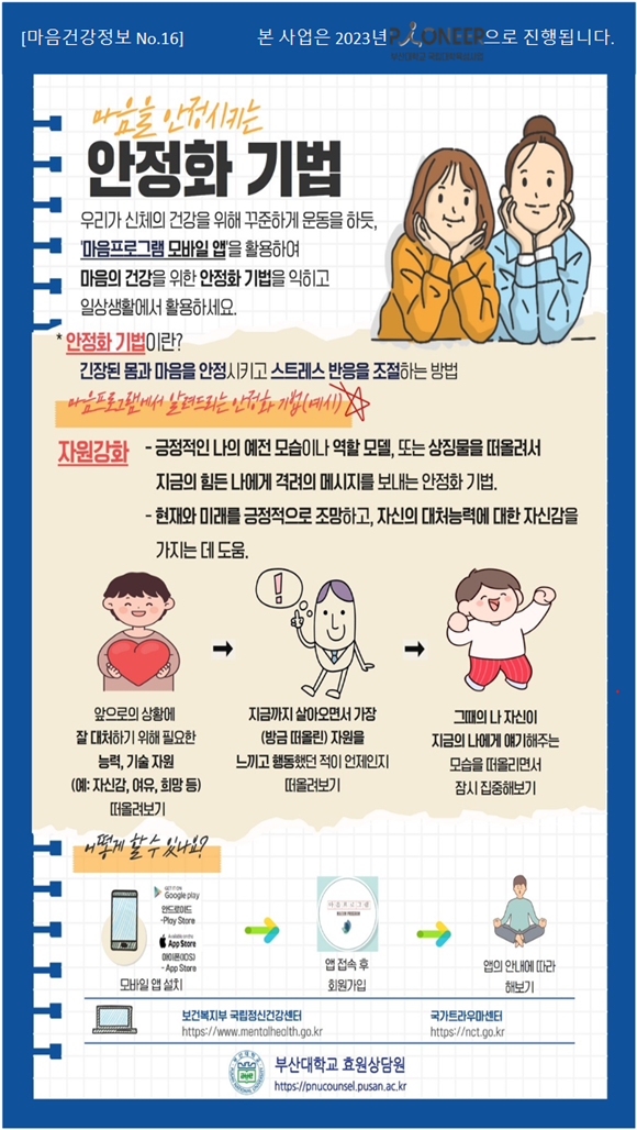 마음의 건강을 위한 안정화 기법을 익히고 일상생활에서 활용해보세요.