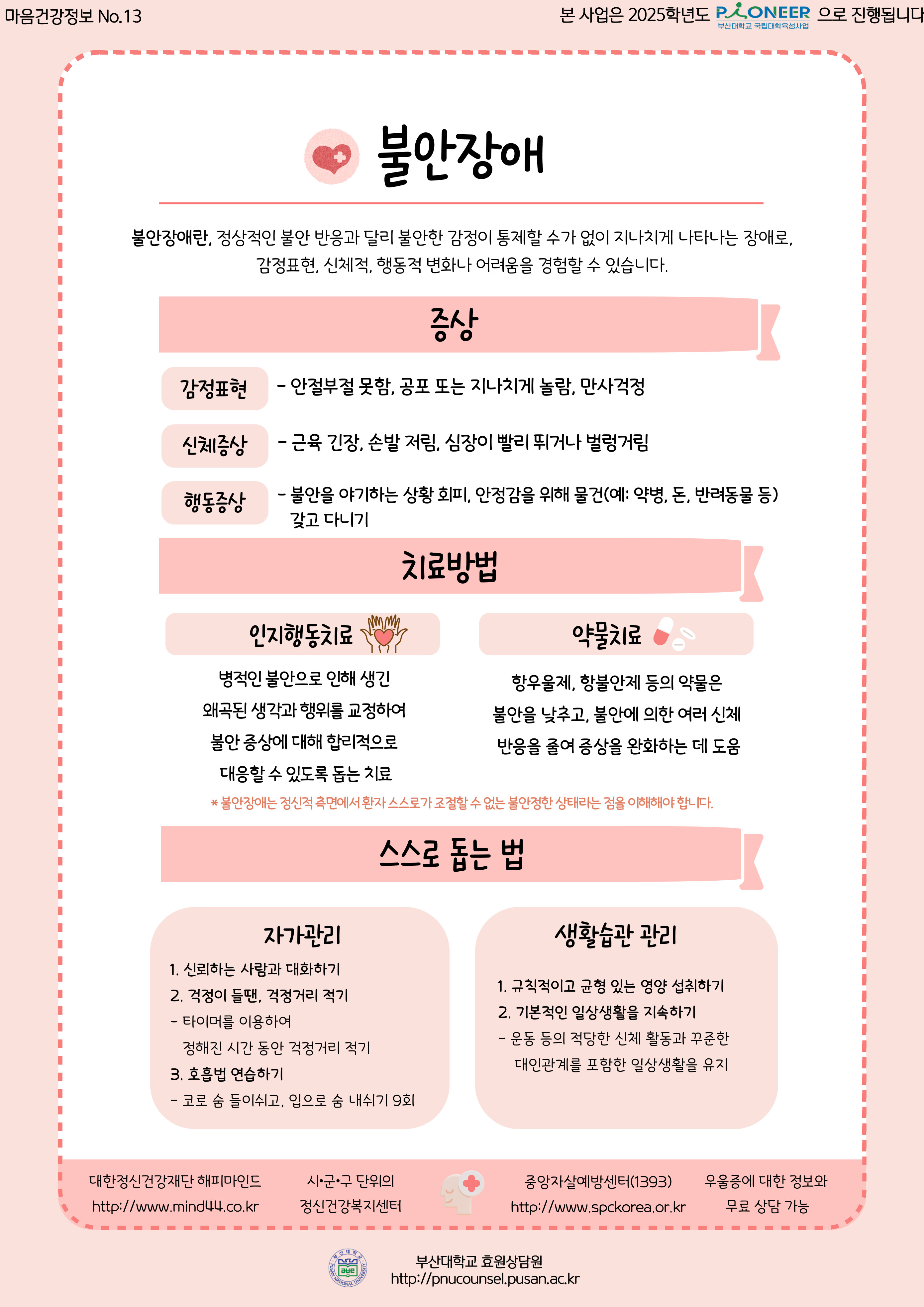 불안장애를 경험할 때 어떤 증상이 나타나는지, 어떤 치료가 필요한지 살펴보고, 일상에서 도움이 되는 '스스로 돕는 방법'을 실천해보아요^^*
